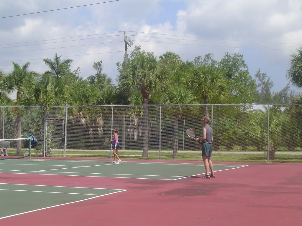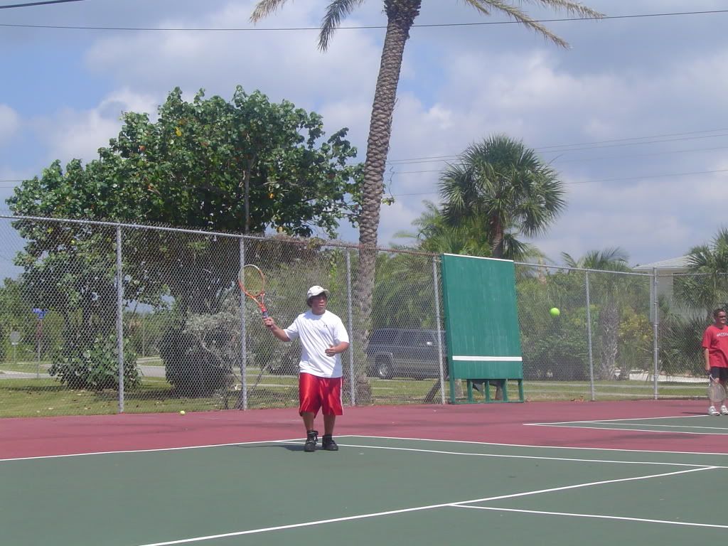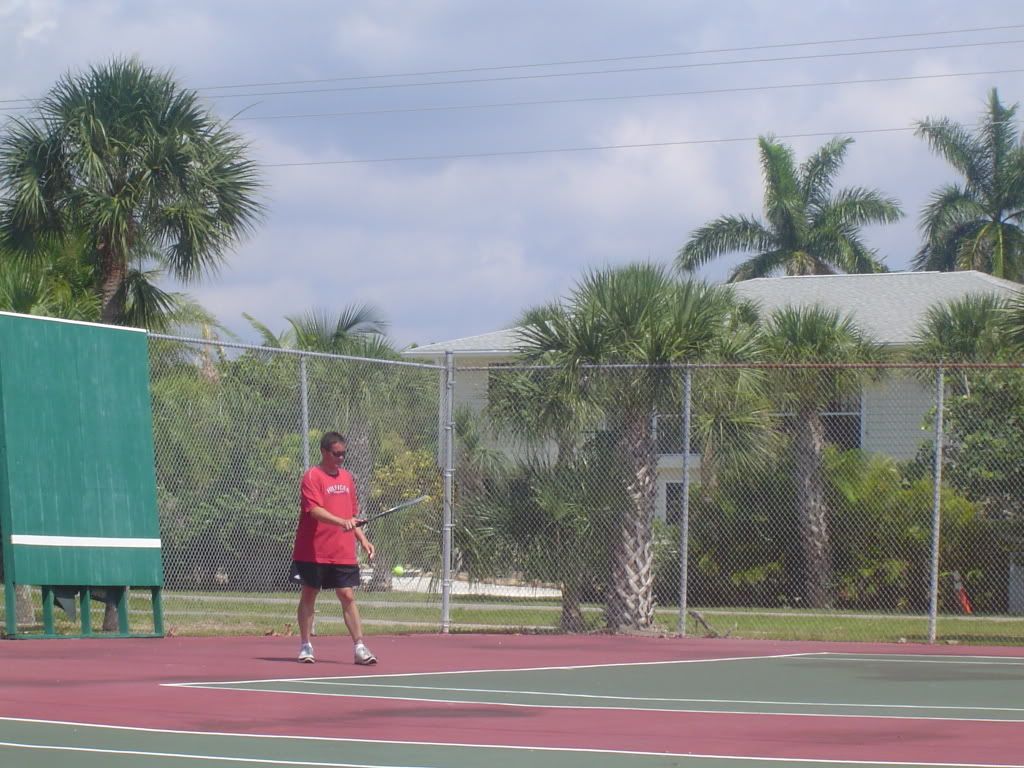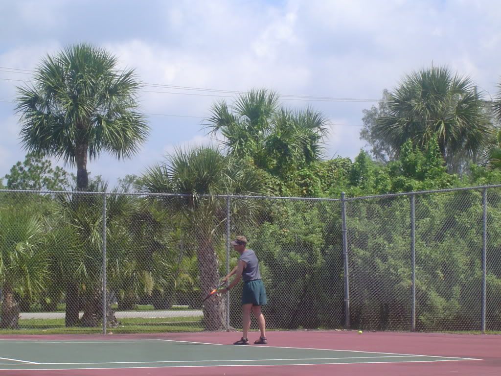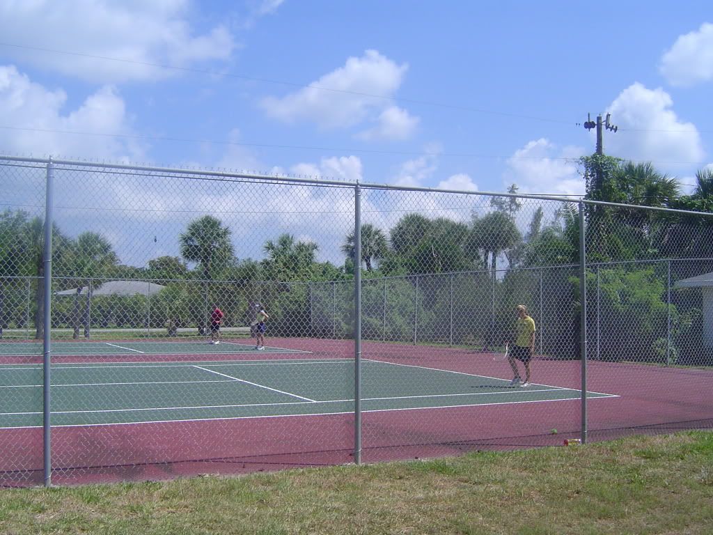 After breakfast my sister Michelle and her husband Joe played tennis with my cousin Mari and her husband Ray. On the other court my nephew Travis played Jamie. After there game dad played with Jamie and then with Travis.
