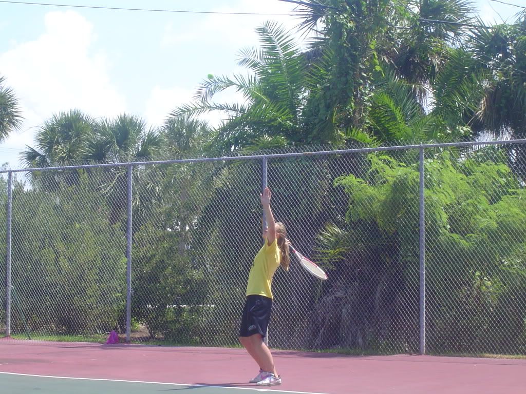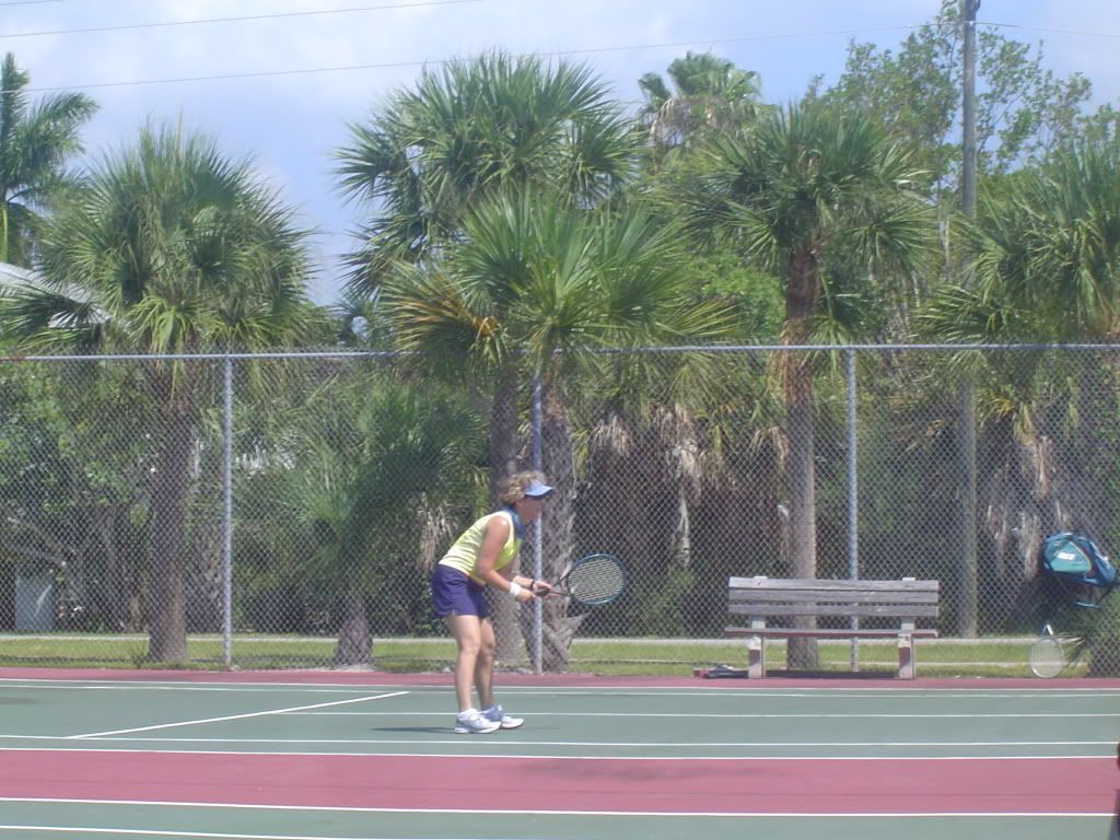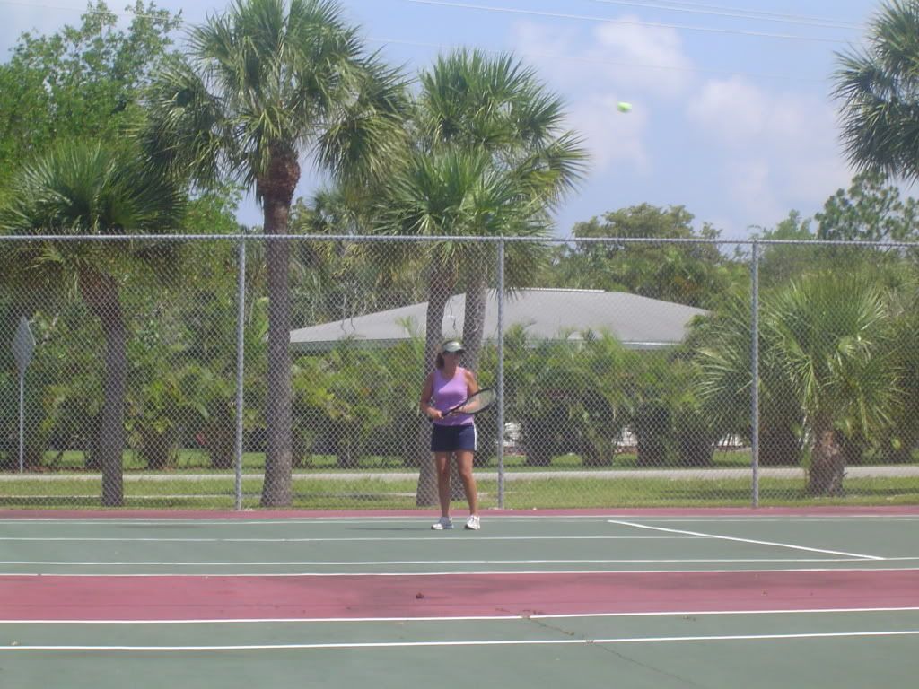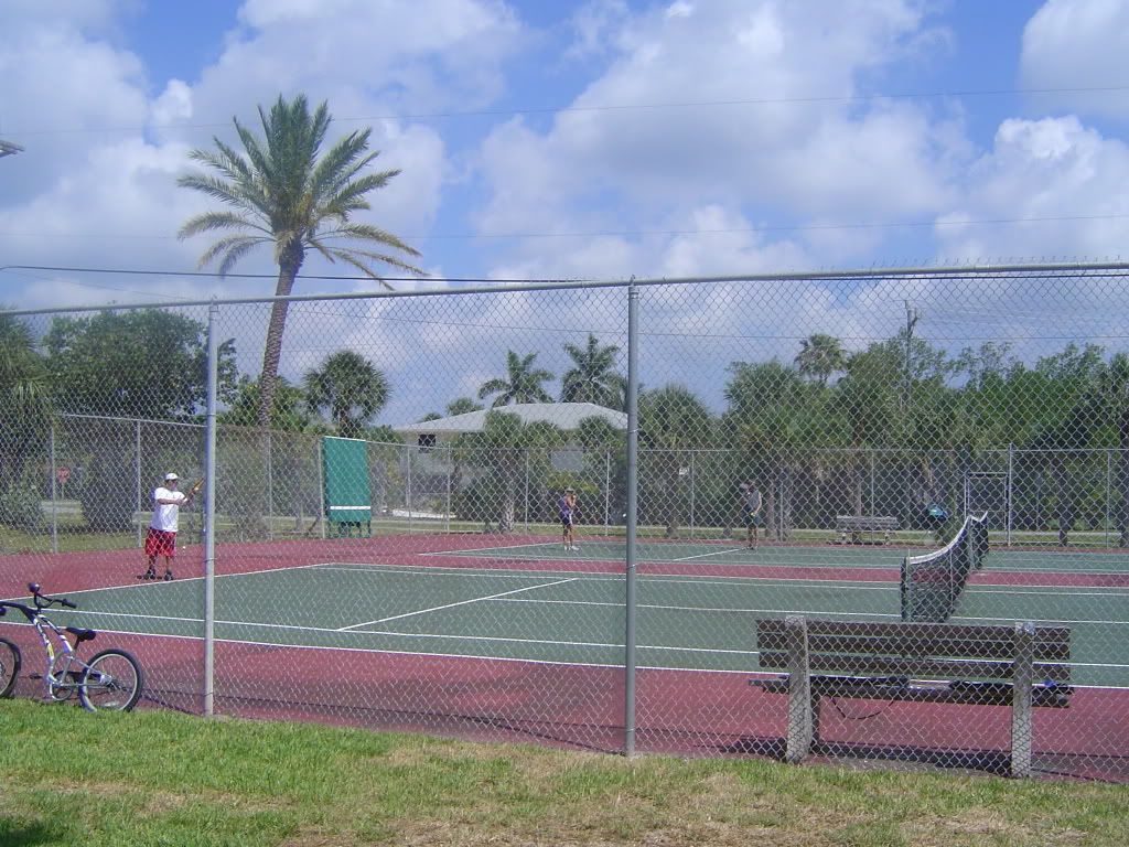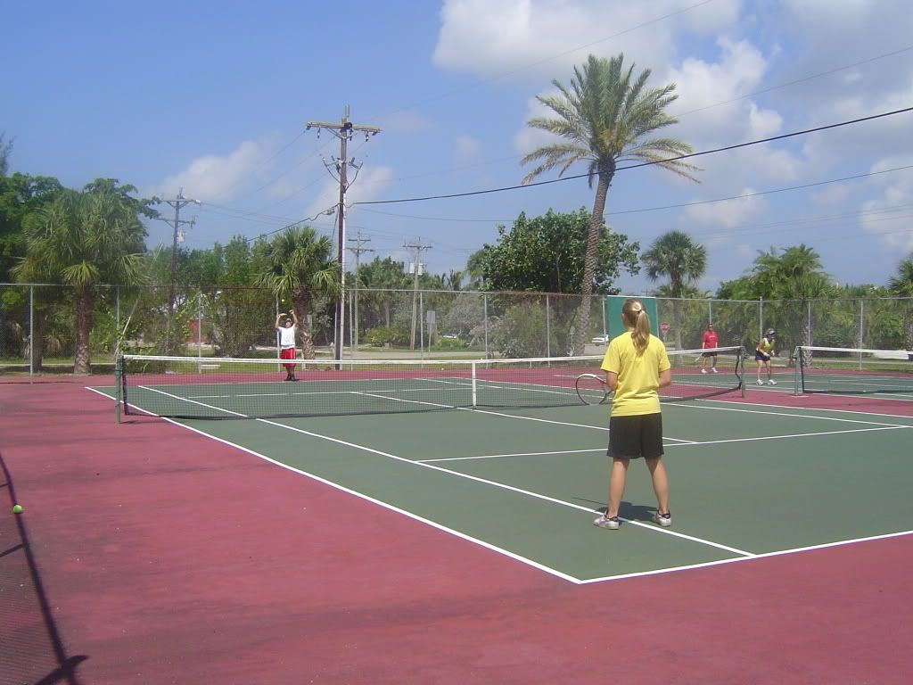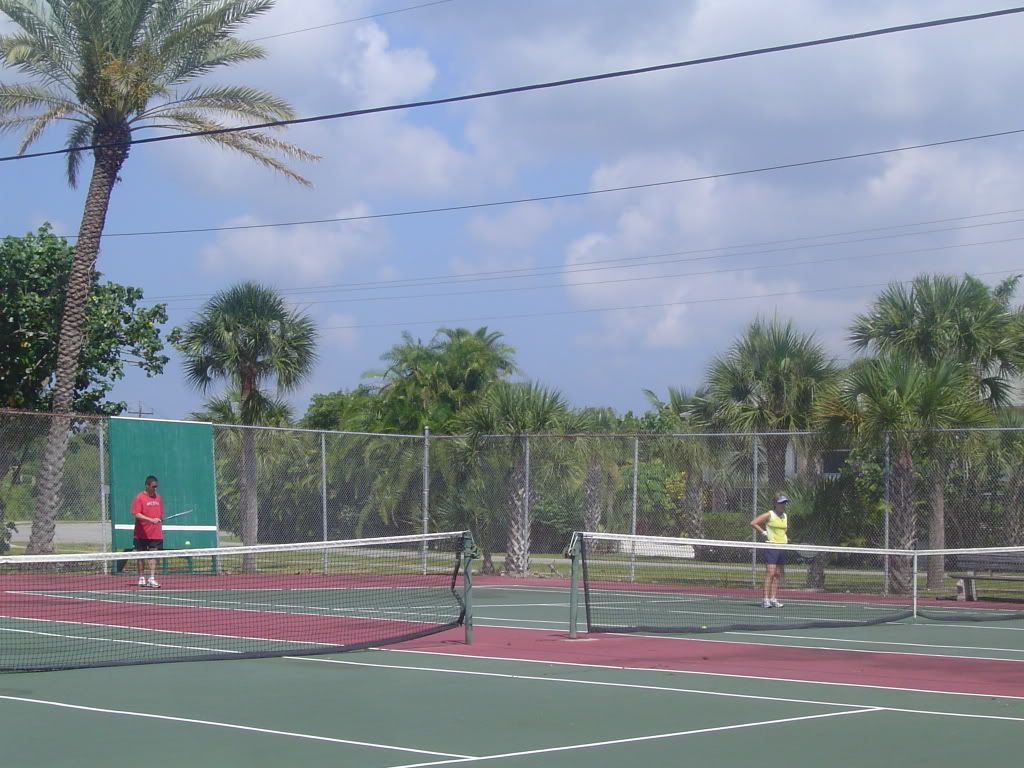 After breakfast my sister Michelle and her husband Joe played tennis with my cousin Mari and her husband Ray. On the other court my nephew Travis played Jamie. After there game dad played with Jamie and then with Travis.