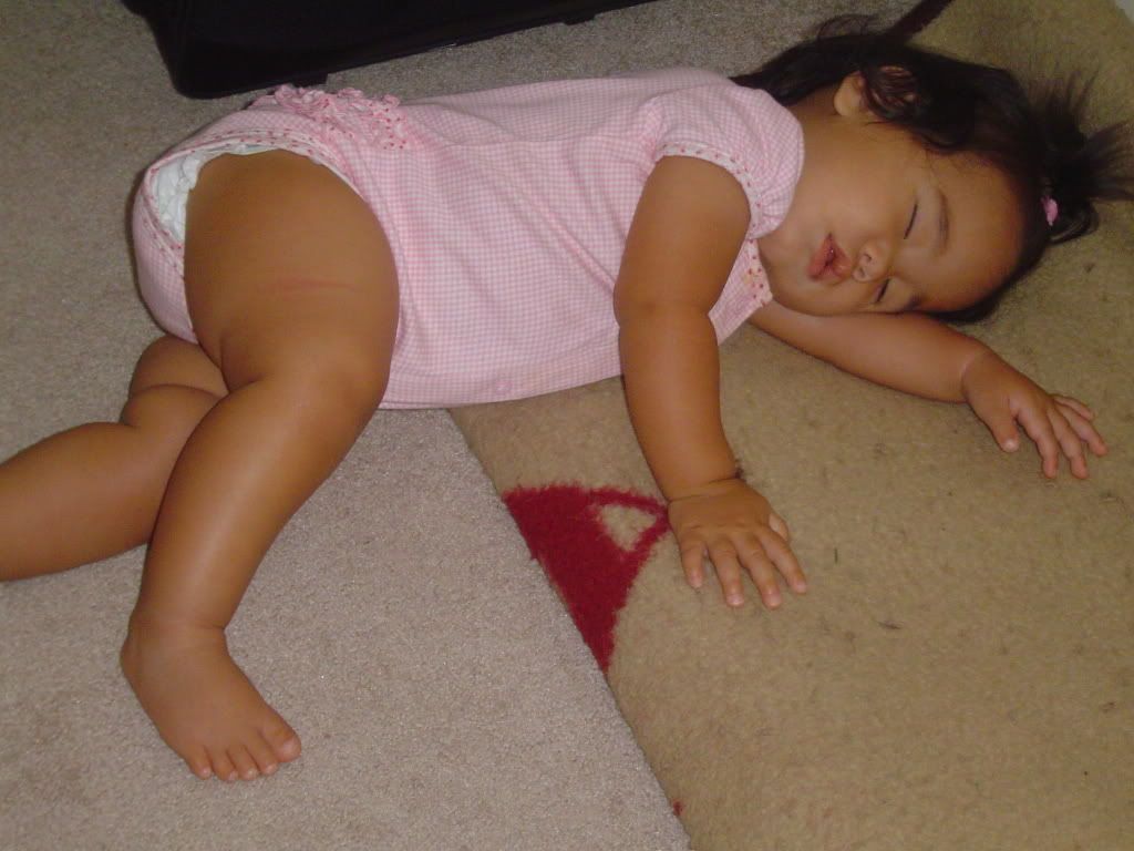 I brought her back home and I was finishing getting ready for the day. As I was finishing up she started rubbing her eyes like she was getting tired. I picked her up and rocked her for about 5 minutes and then she was out like a light. That was around 10:30 this morning . . she didn't wakeup until almost 2pm.