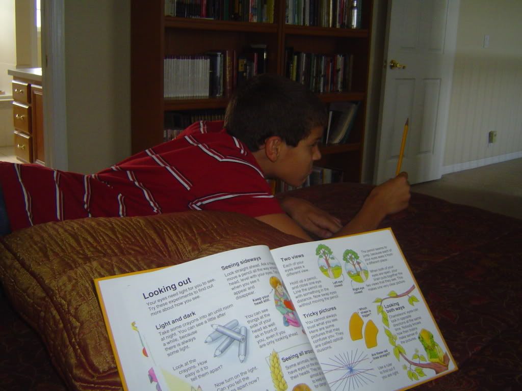 One of his assigments was to create his own Science Experiment. With the help of an USBORNE book . .he did just that. He proved that he eye has two different views but when both eyes are open . . they give one clear picture!